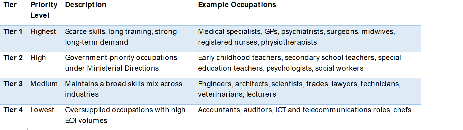 While the tier system is an internal planning tool, not legislation, it offers a practical view of how the Department prioritises occupations in the Skilled Independent program. Understanding this structure helps applicants and employers plan realistic pathways to permanent residency and make informed decisions about whether to pursue independent or employer-sponsored visas